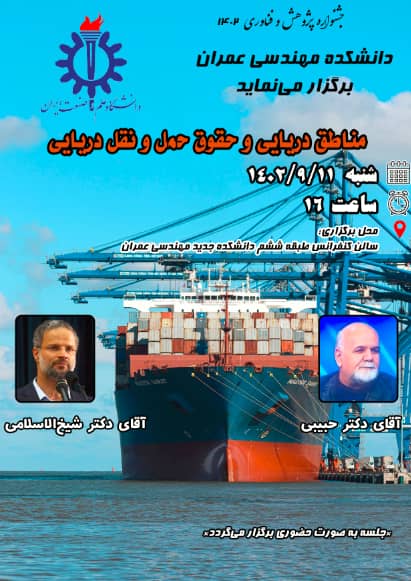 دانشکده مهندسی عمران دانشگاه علم و صنعت ایران در نظر دارد نشستی تخصصی درباره «مناطق دریایی و حقوق حمل و نقل دریایی» توسط دکتر شیخ‌الاسلامی، عضو هیأت علمی این دانشکده و دکتر حبیبی برگزار نماید. این جلسه به‌صورت حضوری در روز شنبه ۱۱ آذرماه ۱۴۰۲ ساعت ۱۶ در سالن کنفرانس طبقه ششم (واقع در ساختمان شماره ۲ دانشکده مهندسی عمران) برگزار خواهد شد. از علاقه‌مندان جهت شرکت در این نشست دعوت به‌عمل می‌آید.